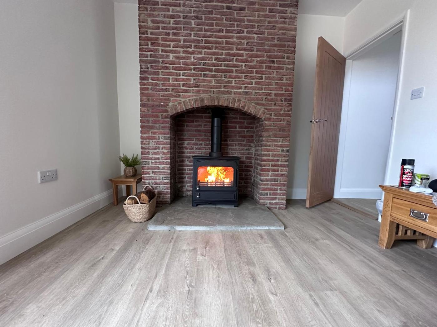 The spacious holiday home features 3 bedrooms, a TV, a fully equipped kitchen with a dishwasher and an oven, a washing machine, and 2 bathrooms with a walk-in shower. There is also a seating area and a fireplace.