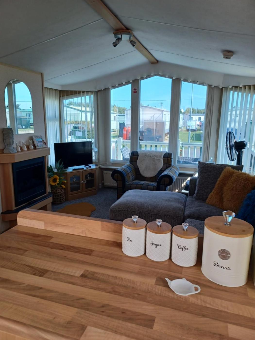 Caravan. The fireplace is the standout feature of this mobile home. This mobile home features 2 bedrooms, a seating area with a sofa and 2 bathrooms with a walk-in shower. Meals can be prepared in the kitchen, which features a stovetop, a refrigerator, kitchenware and an oven. Boasting a balcony with a quiet street view, this mobile home also features a dining area and a flat-screen TV with cable channels. The unit has 3 beds.