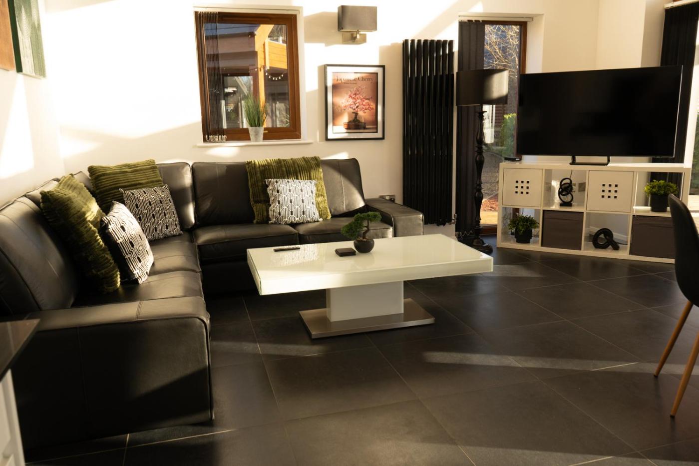 Holiday Home. Guests will have a special experience as the holiday home features a hot tub. This holiday home consists of 2 bedrooms, a seating area with a sofa and 2 bathrooms with a walk-in shower. Meals can be prepared in the well-fitted kitchen, which is equipped with a stovetop, a refrigerator, a dishwasher and a microwave. The holiday home provides a washing machine, a dining area, a wardrobe, an electric kettle, as well as a TV. The unit offers 3 beds.